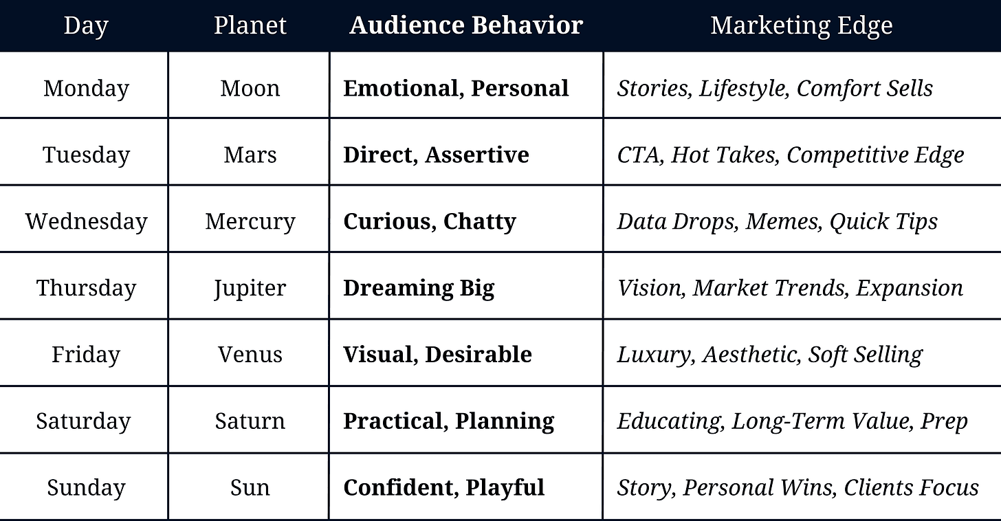 I’m going to show you exactly how I map my marketing — not just by content pillars or trends — but by cosmic behavior.