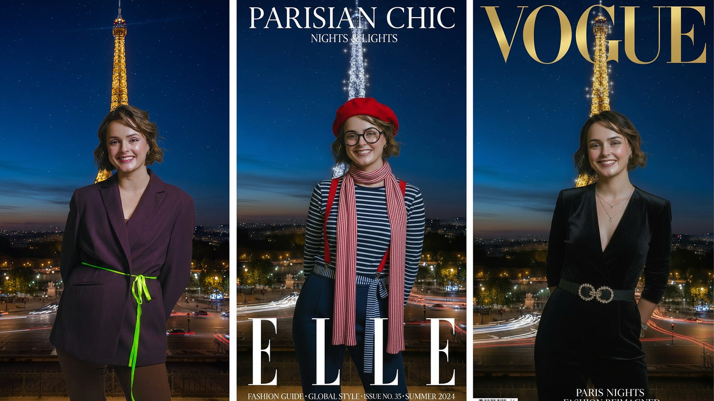 → Example: “Place me at a rooftop café with warm golden sunset lighting.”Outfit Update: