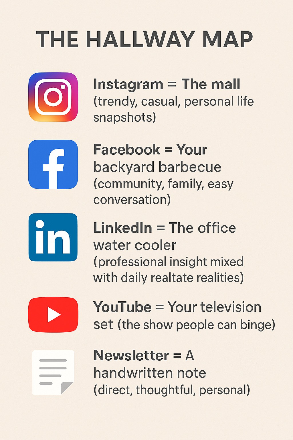 Newsletter (the handwritten note): A short update sharing “what I’m seeing in our market this week.”