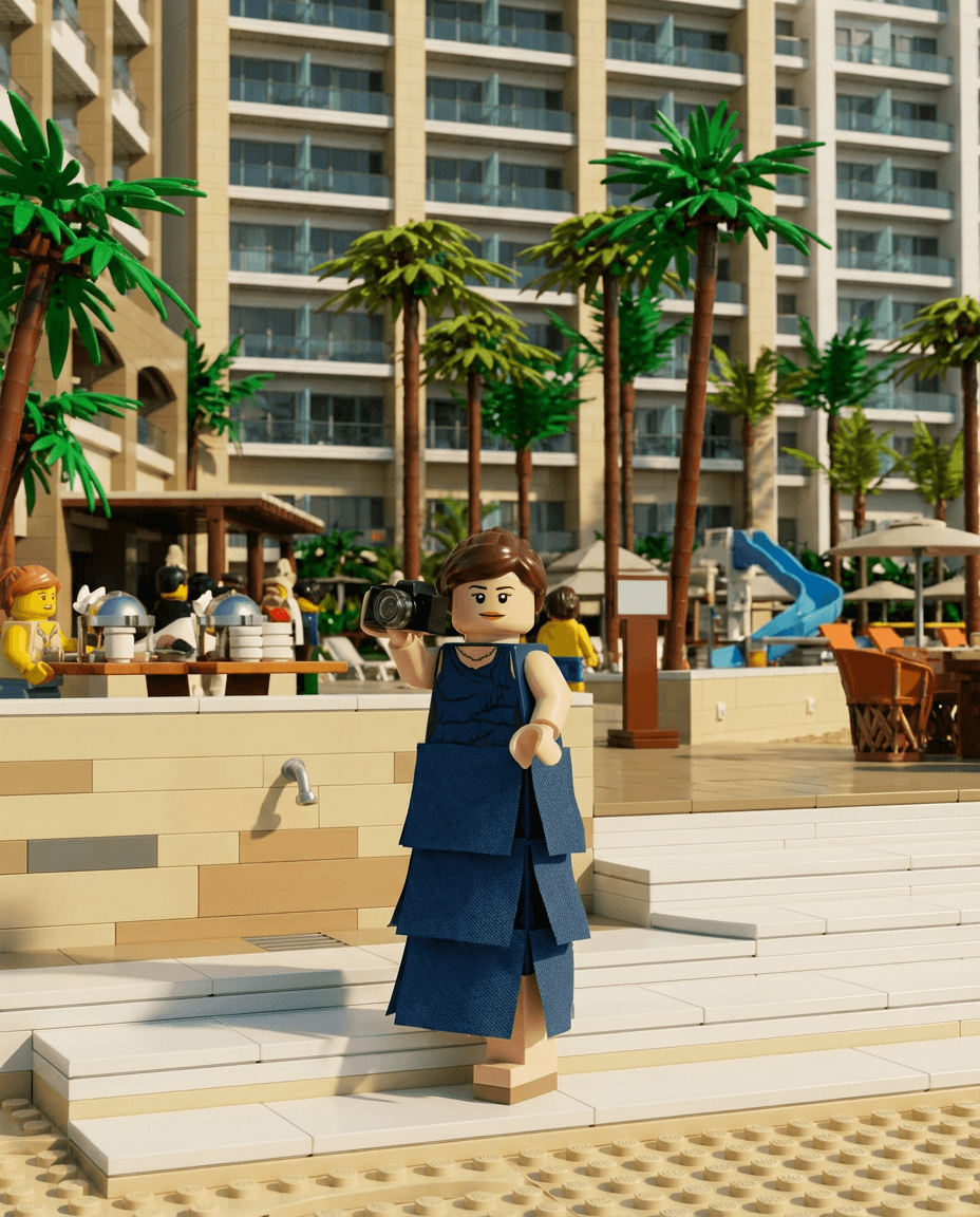The person in the photo becomes a recognizable LEGO minifigure version of themselves, while the entire environment is rebuilt using authentic LEGO pieces and textures.